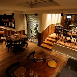 Así mismo, el acceso esta dominado por la barra, ésta muy larga y de materiales muy modernos que finalmente contrasta con el parquet antiguo. Esta zona mezcla tanto los clients de esperan tomando una copa como los que ya están comiendo. Una zona con sofás y silos sirve par alas dos cosas. El salón de abajo y el de arriba ya funcionan como salones tradicionales.