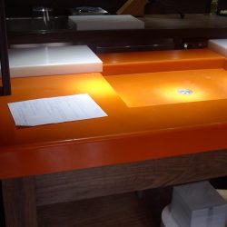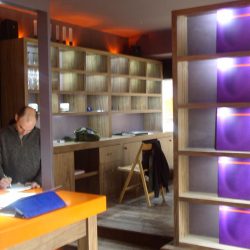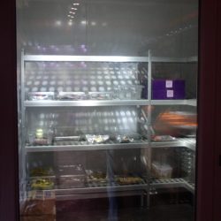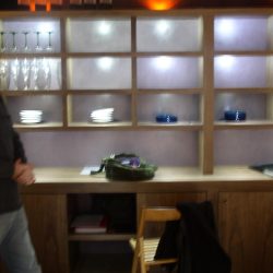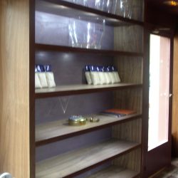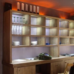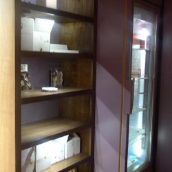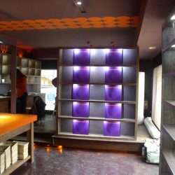 Para esto hemos diseñado una serie de estanterías bien iluminadas donde se expone todo el producto. Lasa estanterías están ubicadas en todos los escaparates, y no tienen fondo, así que se puede exponer el producto hacia afuera y hacia adentro. Aquí hemos resuelto dos temas a la vez. Ya que diseñamos es escaparate para que permita mostrar que es una tienda y una ostrería en si. Los clientes pueden ver la gran mesa central de preparación y donde se exhiben las ostras.