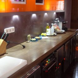 La tienda esta distribuida alrededor de una mesas central de Corian que sirve de mostrador como también de zona de preparación. A un lateral se puede ver la cámara frigorífica con ventana para mostrar el producto almacenada. En la otra esquina del local, encima de una pequeña tarima y separada por una estantería para dar privacidad, se encuentra unas mesas que se pueden juntar o separar y sirven tanto de comedor como de despacho de los dueños.