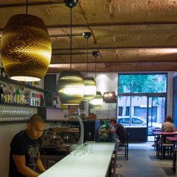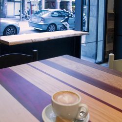 Nos centramos en cambiar el acceso y el salón principal, era un restaurante con un cerramiento de madera que no dejaba ver hacia el interior. Lo cambiamos por una ventana corredera que, cuando el clima acompaña, se puede abrir de par en par dejando una barra de madera de roble natural que sirve de mesa improvisada. Aquí logramos jugar con el afuera, adentro del local y su uso.